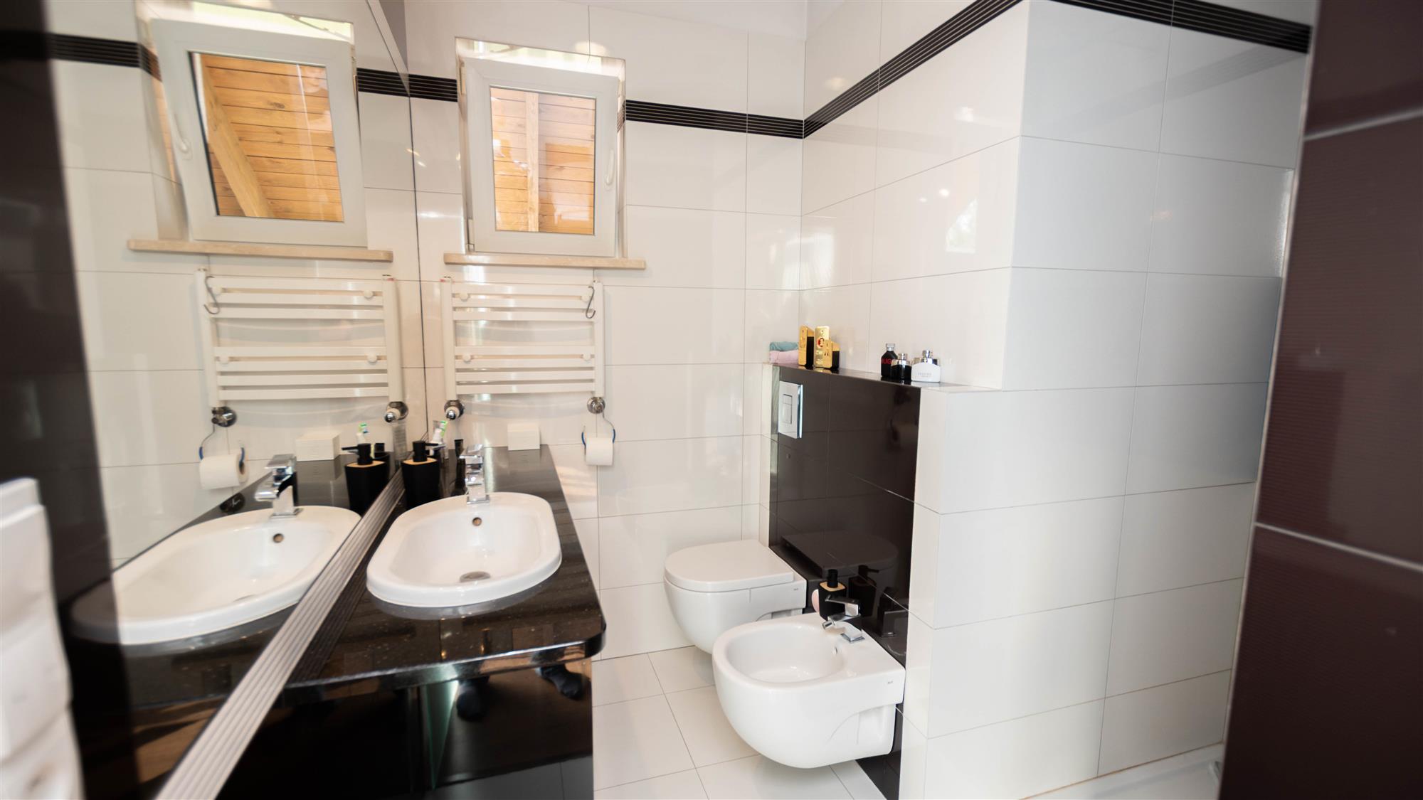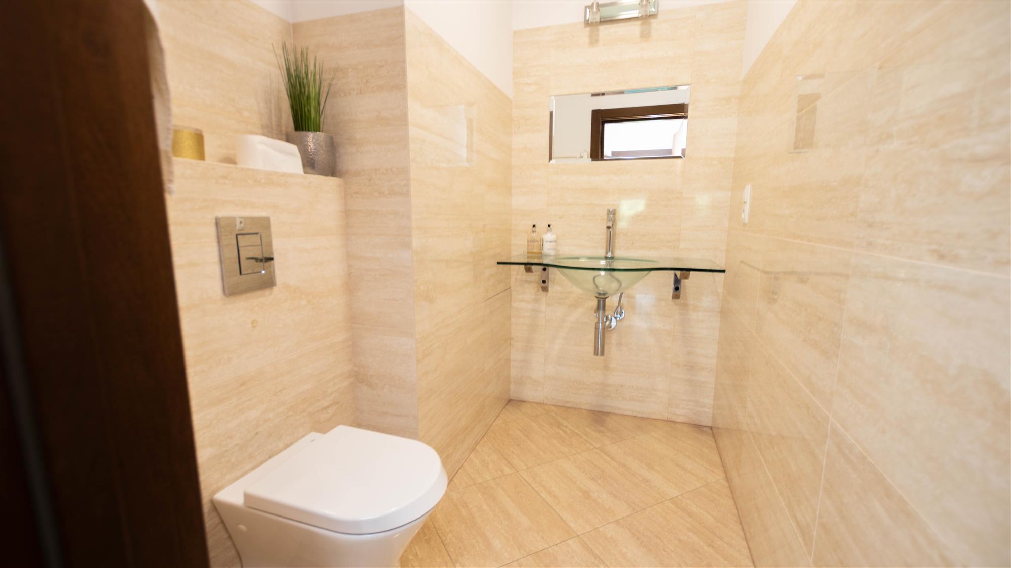Na parterze znajduje się przestronny i jasny salon z wyjściem na taras, kuchnia z jadalnią i spiżarką, hol, łazienka, osobna toaleta, w części północnej parteru jest wejście do trzech pokoi w tym jeden z własną łazienką .