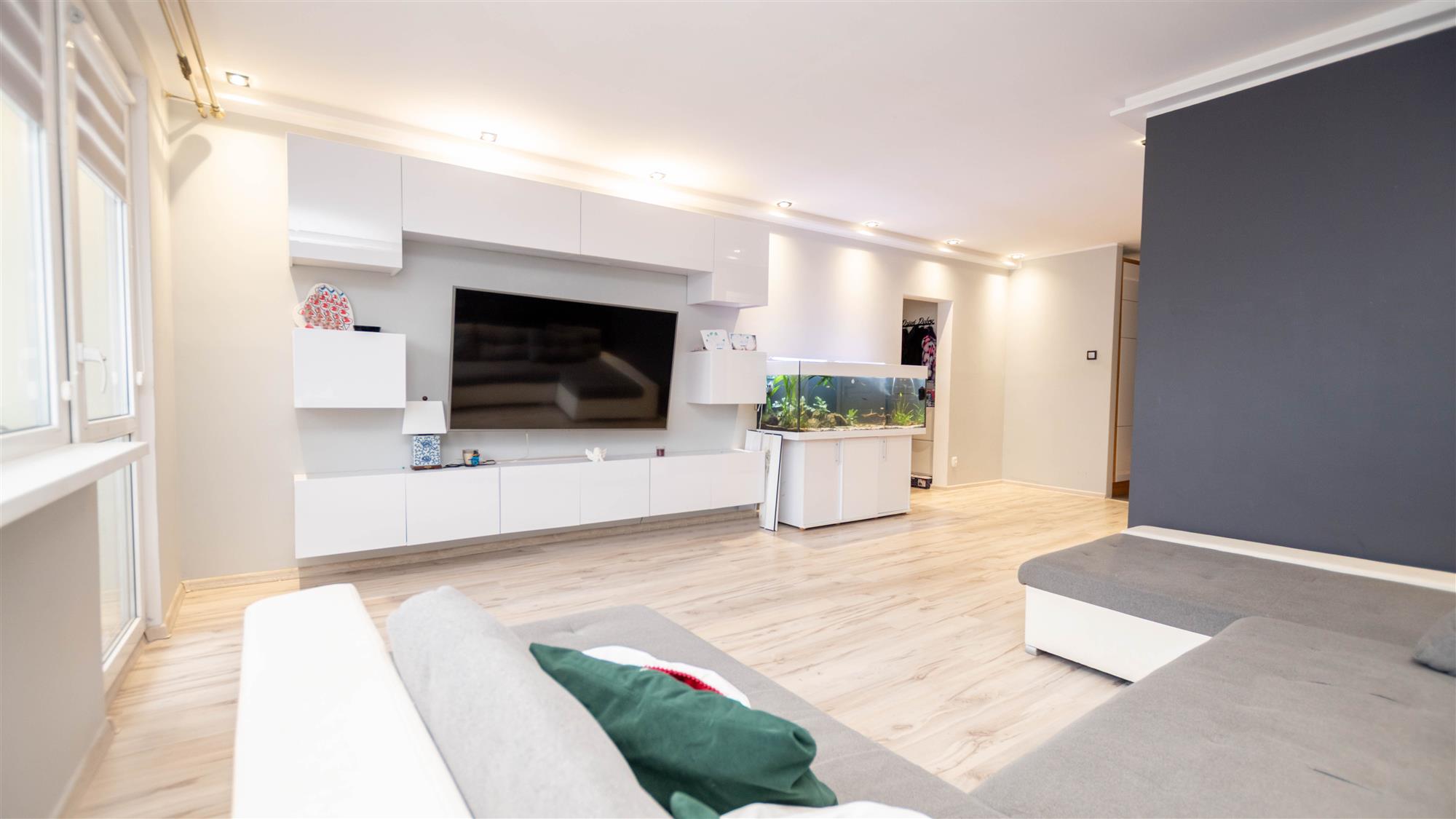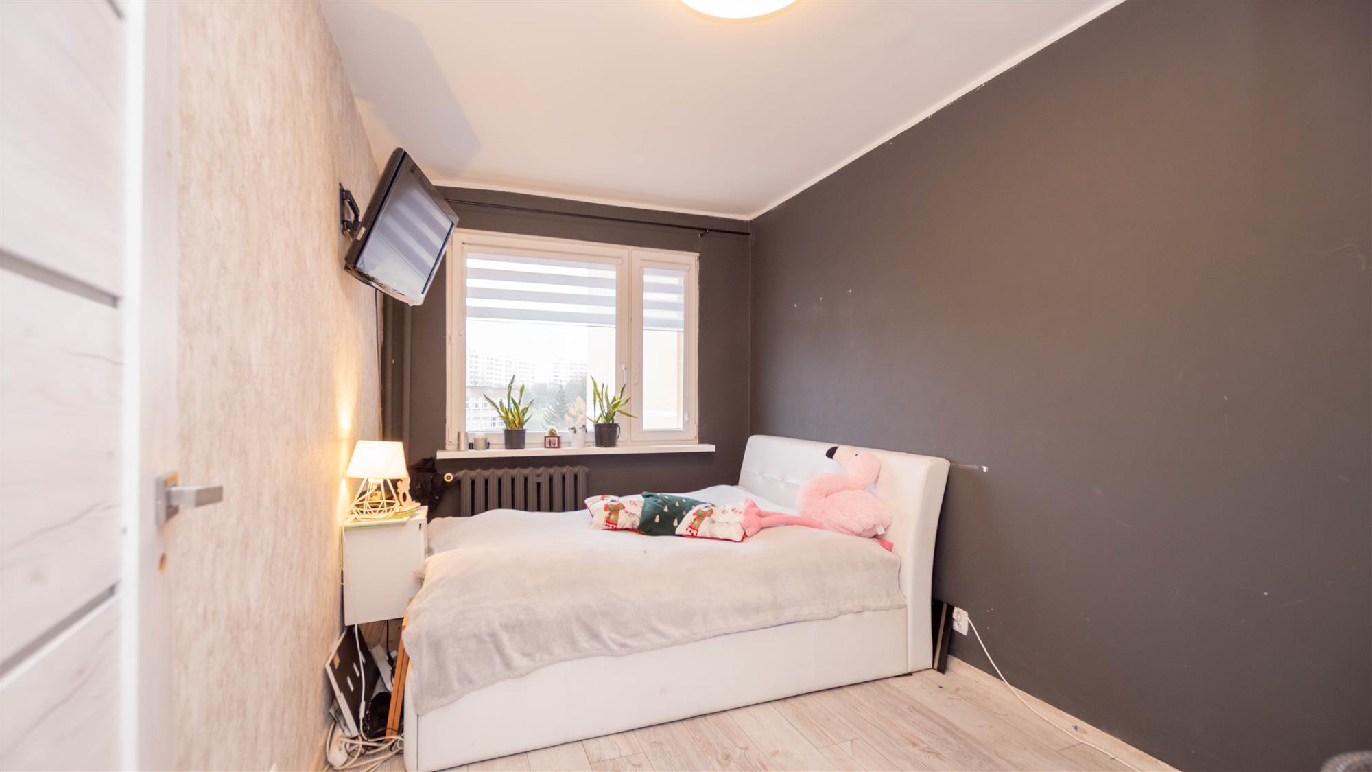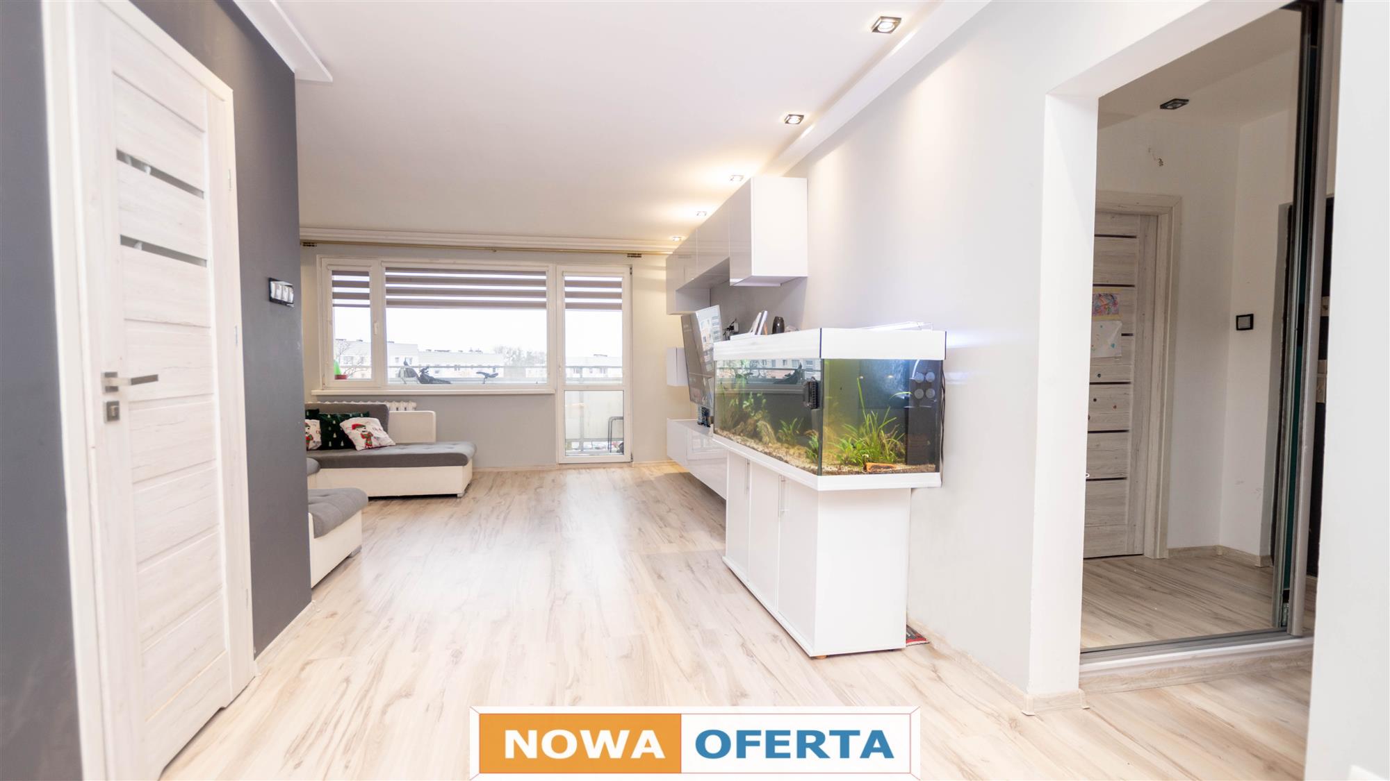 Lokal składa się z salonu z balkonem, dwóch sypialni, kuchni, łazienki, osobnego wc oraz przedpokoju. Okna PCV z wystawą stron świata wschód-zachód. W kuchni zabudowa w bieli wraz ze sprzętem AGD: zmywarka, lodówka z zamrażalką oraz kuchenka. Dodatkowo pralka. Oświetlenie LED w salonie oraz kuchni. Instalacja elektryczna miedziana. Podczas remontu zmieniono funkcjonalność mieszkania poprzez wyburzenie ścianek działowych, co spowodowało powiększenie przestrzeni oraz lepsze doświetlenie mieszkania. Możliwość pozostawienia umeblowania widocznego na zdjęciach. Mieszkanie do ewentualnego odświeżenia. Wc do remontu.