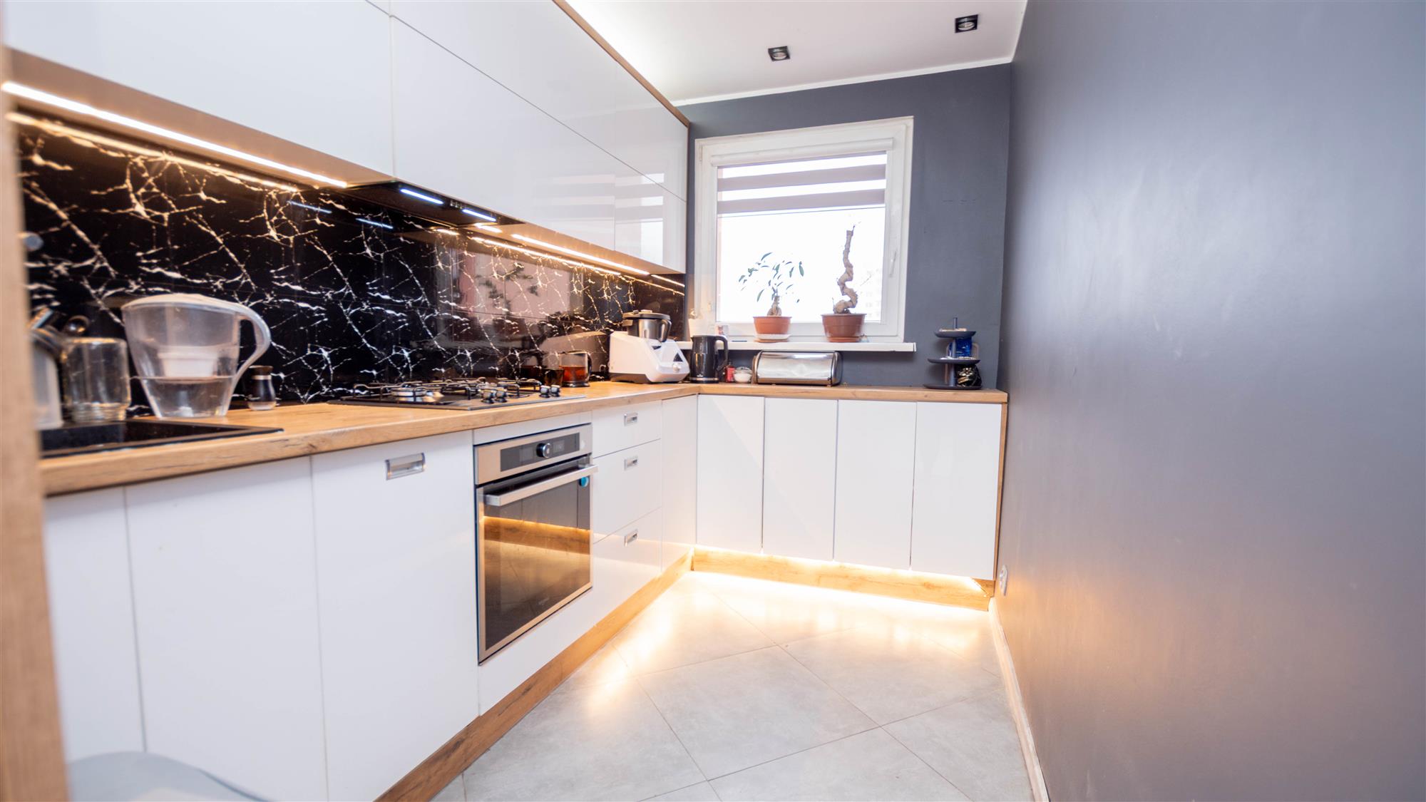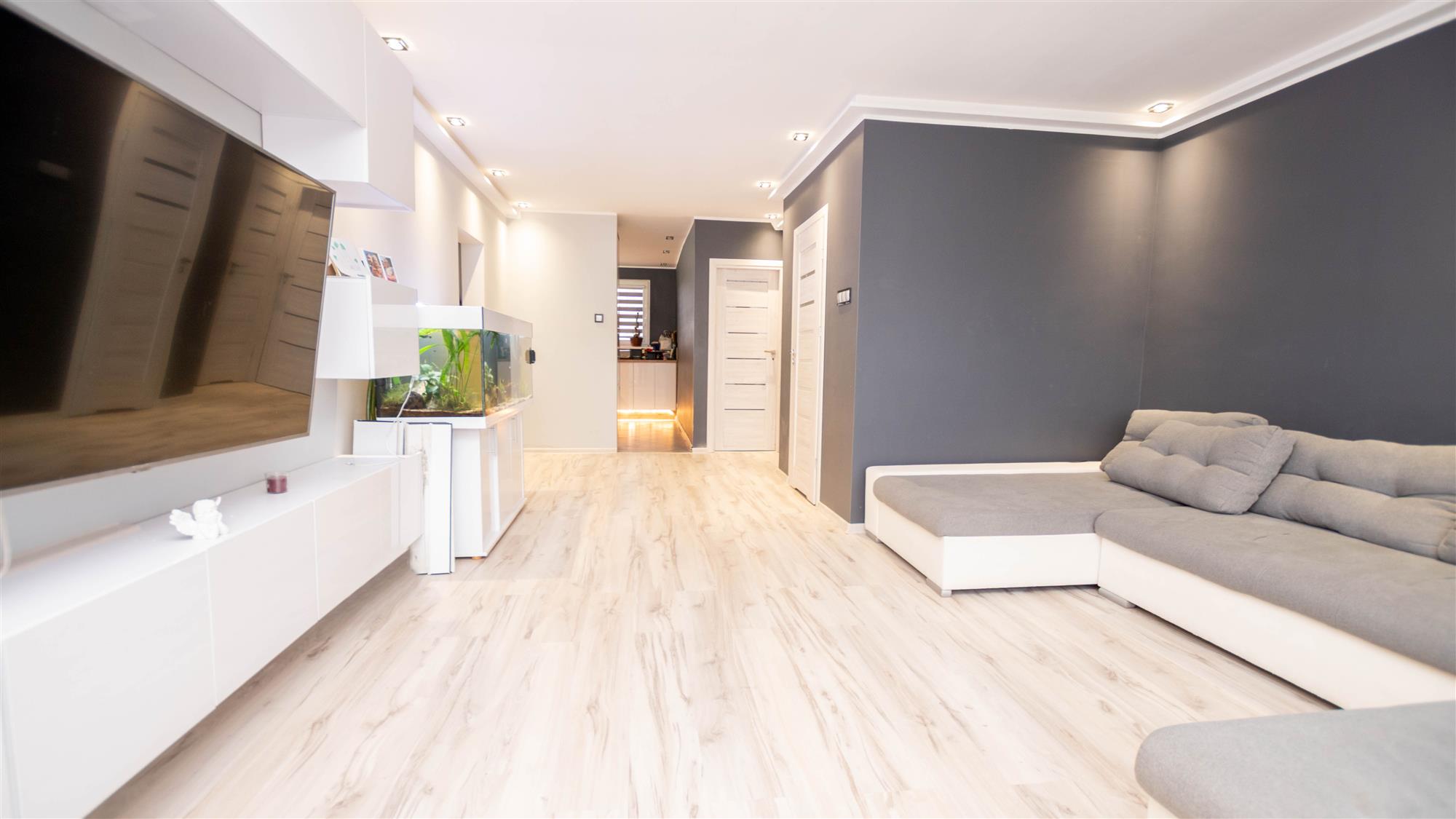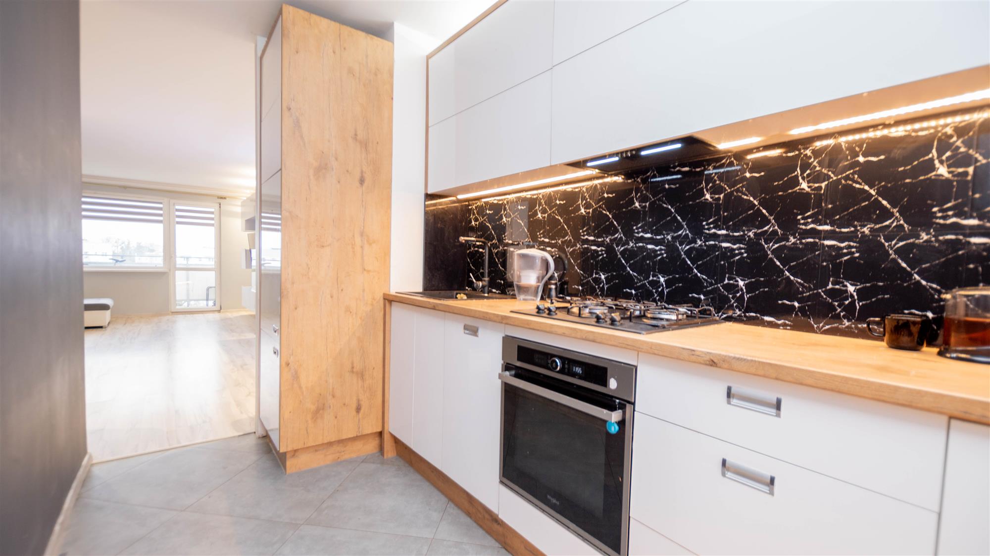 Lokal składa się z salonu z balkonem, dwóch sypialni, kuchni, łazienki, osobnego wc oraz przedpokoju. Okna PCV z wystawą stron świata wschód-zachód. W kuchni zabudowa w bieli wraz ze sprzętem AGD: zmywarka, lodówka z zamrażalką oraz kuchenka. Dodatkowo pralka. Oświetlenie LED w salonie oraz kuchni. Instalacja elektryczna miedziana. Podczas remontu zmieniono funkcjonalność mieszkania poprzez wyburzenie ścianek działowych, co spowodowało powiększenie przestrzeni oraz lepsze doświetlenie mieszkania. Możliwość pozostawienia umeblowania widocznego na zdjęciach. Mieszkanie do ewentualnego odświeżenia. Wc do remontu.